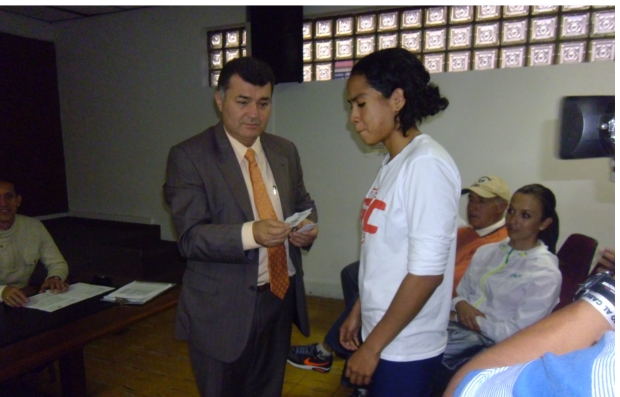 Fabio Andrés Hincapié, Secretario del Deporte, les entregó, simbólicamente, los bonos y las ayudas en especie a los deportistas beneficiados. Tenis, bonos para mercado y los implementos que recibirá la Secretaría para dotar sus instalaciones de un espacio para la concentración de los deportistas.