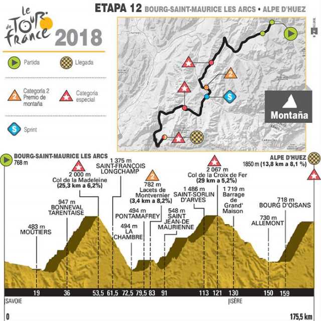 Los grandes puertos de los Alpes llegan a su final con la duodécima etapa, la más larga de estas tres jornadas con 175 kilómetros entre Bourg Saint Maurice y Alpe d'Huez, en la que se ascenderán tres puertos fuera de categoría, el Col de la Madeleine y el Col de la Croix de Fer, además de la subida final hasta la línea de meta.