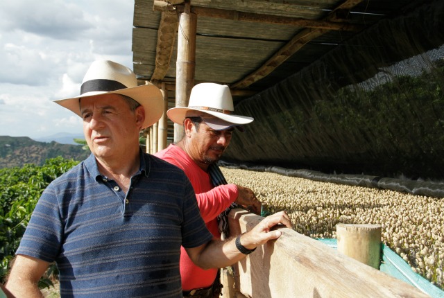 Junto con Fernando Valencia y Gilberto Martínez, Alfonso Ángel Uribe revisa la producción de café de fin de año.