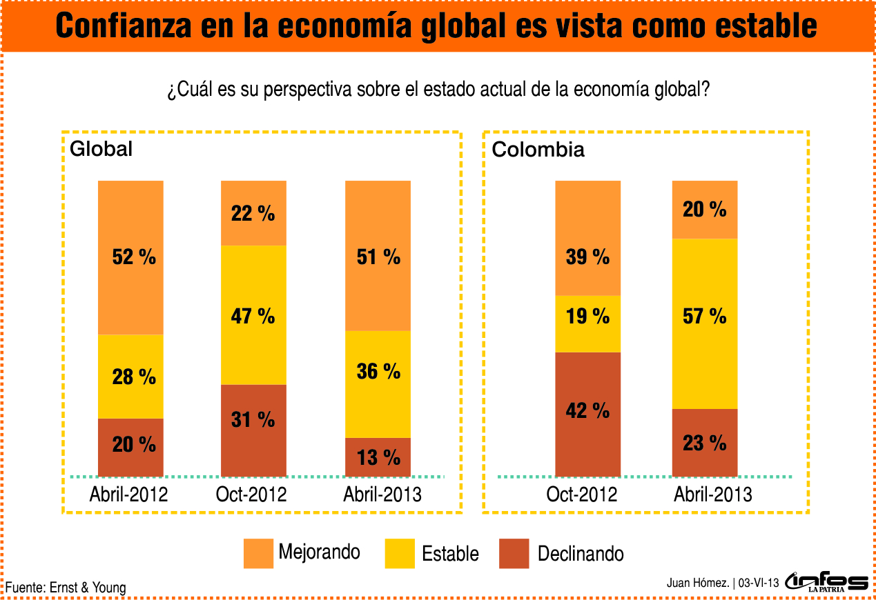 En el caso mundial, el balance es más positivo, como quiera que el grado de confianza económica mejoró. En parte, por las expectativas positivas en torno al crecimiento económico, los beneficios empresariales y la disponibilidad de crédito. Eso generó que ahora el 87 % de las empresas vea a la economía mundial entre estable y tendiente a mejorar.