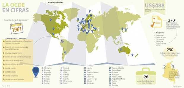 La Ocde es un organismo del cual hacen parte 34 miembros. El objetivo de la organización es intercambiar las prácticas de cada nación, promover reformas globales y mejorar políticas nacionales. En la actualidad, hay tres países en proceso de adhesión (Colombia, Rusia y Letonia) y hay cinco más como aliados estratégicos (Indonesia, India, China, Brasil y Sudáfrica). El presidente Juan Manuel Santos, en mayo de 2012, envío una carta oficial pidiendo el ingreso.