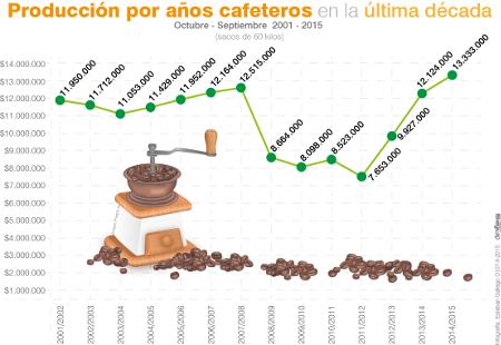 Colombia cerró el año cafetero octubre 2014 - septiembre 2015 con la mejor producción en 22 años. Se cosecharon 13 millones 333 mil sacos. La esperanza de los cafeteros es que este año la cosecha sea incluso mayor.