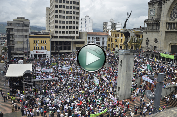 El senador Jorge Enrique Robledo lideró la movilización y asegura que el Gobierno en vez de apoyar a los cafeteros les trata de poner más trabas. "Es terrible que piensen en aumentar la contribución cafetera, cuando el precio y la producción van en picada", dice el congresista.
