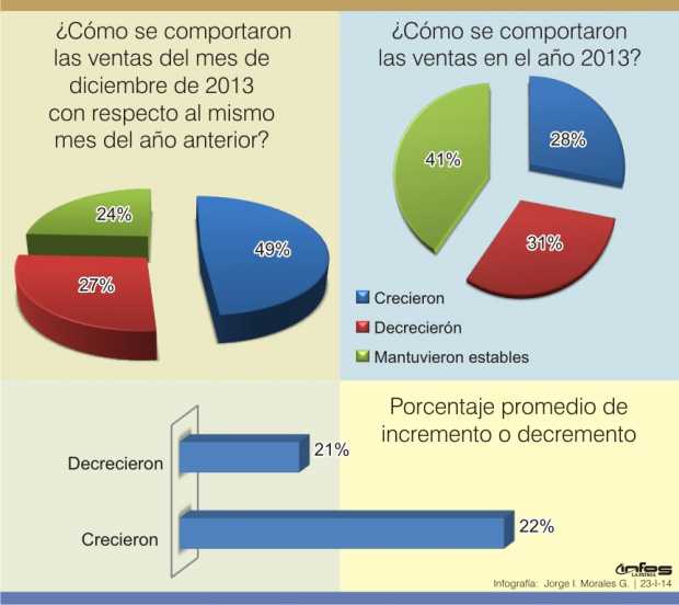 De acuerdo con el estudio, el 49% de los empresarios aseguró que sus ventas se incrementaron hasta en el 22%, con respecto al mismo período del año anterior (ver infográficos: ventas en diciembre y en todo el 2013).