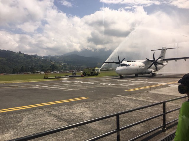 A las 10:05 de la mañana de ayer aterrizó en el aeropuerto La Nubia, de Manizales, el primer vuelo de la aerolínea Easyfly. Llegó de Medellín con 33 pasajeros.