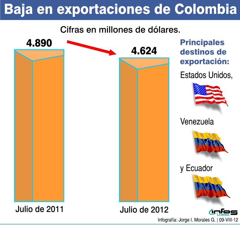 Según el último informe del Departamento de Impuestos y Aduanas Nacionales (DIAN), aunque el peso exportado en julio habría aumentado 10,3%, las ventas al exterior en el mismo mes habrían caído 5,5%.