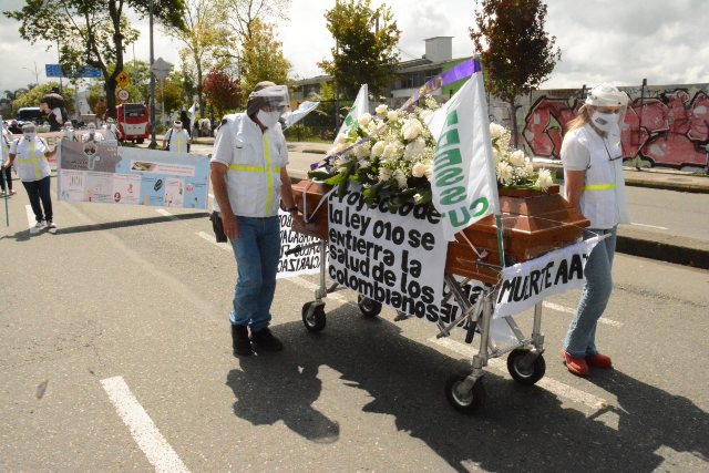 El recorrido lo encabezó un féretro con mensajes alusivos al proyecto de Ley 010 del 2020 con el que, según el Sindicato Nacional de la Salud y Seguridad Social, continuarán los paseos de la muerte. También exigieron estabilidad laboral para los trabajadores de la salud.