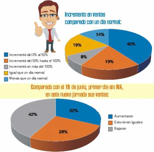 El informe por sectores demostró que los electrodomésticos y equipos de cómputo mantuvieron la buena racha. Aunque, tal y como se esperaba, hubo un descenso frente al primer día sin IVA, comparado con un día normal aumentaron hasta en 50%, según un 28% de los consultados. Un 32% estimó que ascendieron entre el 51% y hasta el 100% y un 10% celebró que subieron hasta 200%.