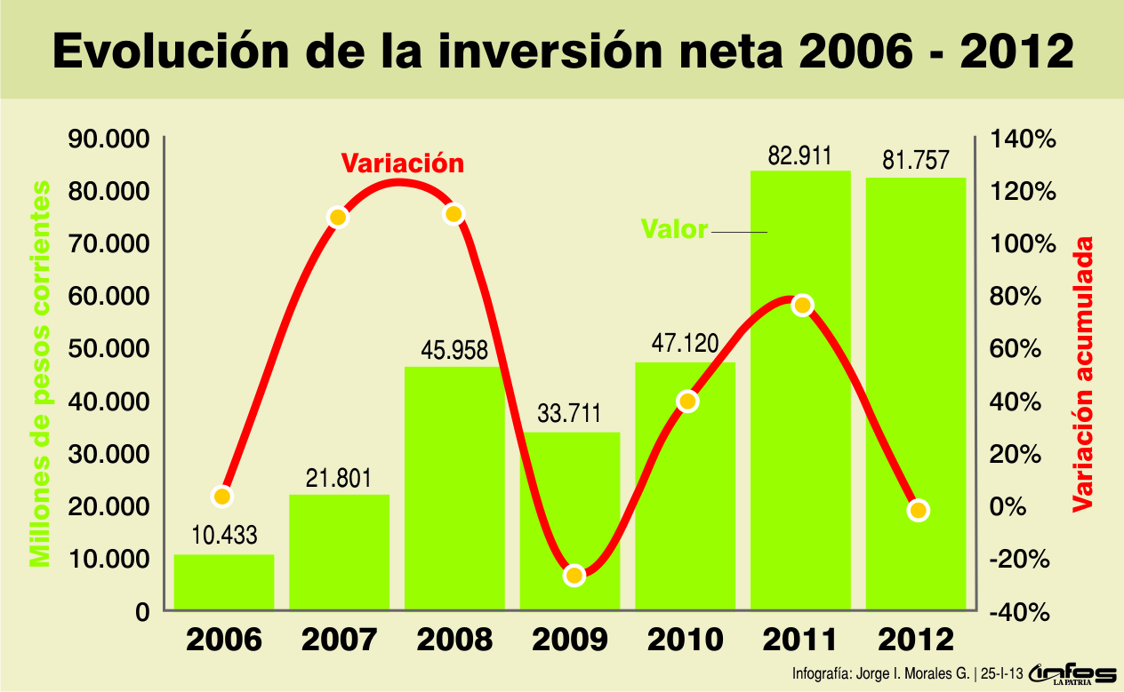 El efecto negativo que contrajo la inversión se debió a las reformas de capital, ensanche o mejoramiento de empresas, pues mientras en 2011 se reformaron o mejoraron 112 compañías, por un valor de $76 mil 10 millones, en 2012 fueron 111, pero con un capital de $53 mil 947 millones, un descenso del 29%.
