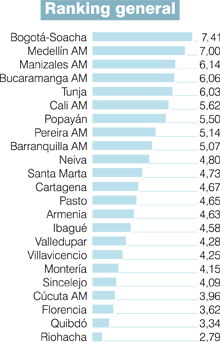En el Eje Cafetero Manizales fue la mejor rankeada, teniendo en cuenta que Pereira se encuentra cinco puestos más abajo y Armenia se ubica en la casilla 14. (ver infográfico: ranking general).