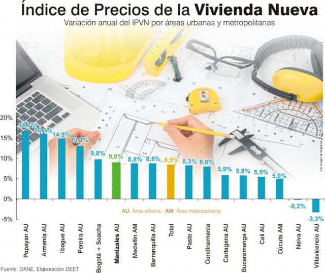 Según el último informe del Departamento Administrativo Nacional de Estadística (DANE) sobre el Índice de Precios de Vivienda Nueva (IPVN) con corte al tercer trimestre de 2016, la capital de Caldas ocupa el sexto lugar dentro del top de ciudades con el mayor incremento en precio por metro cuadrado de vivienda, con una variación anual de 8,98%, por encima del total nacional (8,48%).