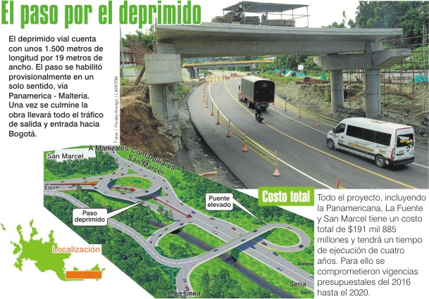 El deprimido vial cuenta con unos 1.500 metros de longitud por 19 metros de ancho. El paso se habilitó provisionalmente en un solo sentido, vía Panamericana - Maltería. Una vez se culmine la obra llevará todo el tráfico de salida y entrada hacia Bogotá.
