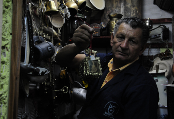 En un espacio de tres por dos metros guarda camas desarmadas, lámparas, candelabros, fruteros, marcos, entre otros elementos. Relata que empezó en el oficio hace 60 años, luego de tener una chatarrería en el mismo sector. Algunas de las antigüedades las consiguió en ese negocio, al que llegaban elementos de bronce o hierro que las familias dejaban. Con lo que tenía empezó a recorrer las calles de la ciudad, pero se cansó de que los funcionarios de Espacio Público lo movieran de todos los sitios y se ubicó de nuevo en un local. El problema llegó cuando viajó a Villavicencio hace unos 10 años para aprovechar el mercado de ese municipio y le robaron toda la mercancía que llevaba en un camión.