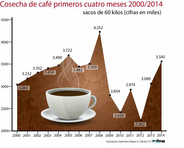 El indicador es mejor, teniendo en cuenta que se alcanzó nuevamente el mejor reporte de los últimos seis años, luego de que en el 2008, en el primer cuatrimestre, se cosecharon 4 millones 252 mil sacos de 60 kilos.