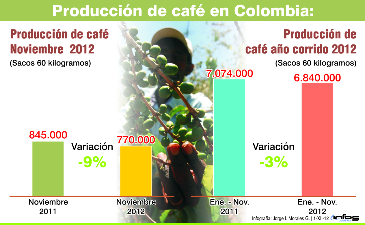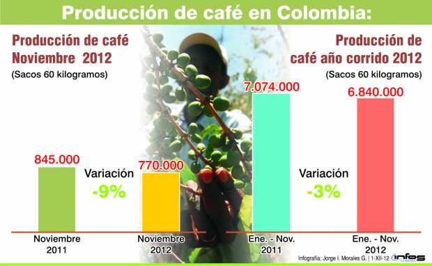 Las estimaciones comienzan, después de que la Federación de Cafeteros anunció que entre enero y noviembre de este año se produjeron 6 millones 840 mil sacos, un descenso del 3% con respecto al mismo lapso del año anterior.