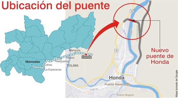 El nuevo puente está a 2,5 kilómetros hacia el norte del conocido Puente Andrade que cruza el Río Magdalena en Honda.
