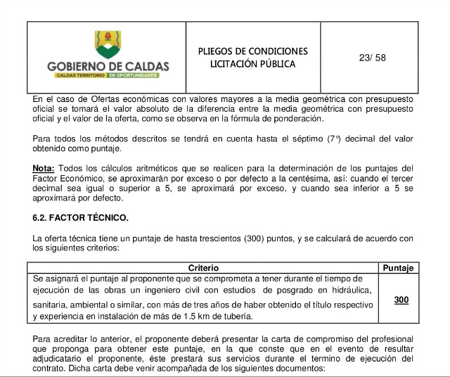 El ingeniero se queja de la especificación que se plantea en la licitación, pues resalta que existen muy pocos profesionales con esas características en la ciudad. Agrega que la responsabilidad de los diseños es de quien publica la licitación y no del contratista. Critica que la exigencia de especialista en hidráulica otorgue 300 puntos para la licitación. "Eso le da a uno la idea de que eso lo tienen organizado, que esté dirigida", critica.