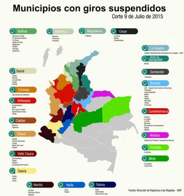 El Departamento Nacional de Planeación (DNP) suspendió, de manera preventiva, el giro de regalías para Riosucio y Salamina, por cerca de $700 millones, por falta de información en el Sistema General de Regalías. De acuerdo con la oficina de comunicaciones del DNP, la medida pretende que las alcaldías actualicen los datos sobre el avance de ejecución de los recursos para proyectos aprobados por los Órganos Colegiados de Administración y Decisión (OCAD) en los aplicativos de la entidad. Lo mismo ocurrió con otros 57 municipios del país,
