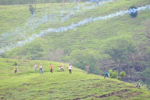 Hacia la 1:30 de la tarde, unos 200 metros antes del peaje de La Felisa, los manifestantes ya tenían la vía inundada de rocas y palos. "Se vive, se siente, la minga está presente", gritaban desde la montaña. El Escuadrón móvil antidisturbios (Esmad) también hacía lo suyo y desde la carretera lanzaba gases lacrímogenos para dispersarlos y poder recuperar la movilidad. En el sector conocido como El Palo, a la entrada de Supía, también hubo bloqueo de la vía.