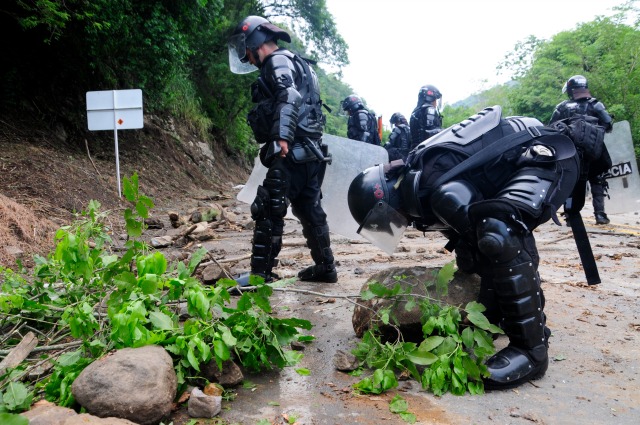 Necton Lincoln Borja Miranda, comandante de la Policía en Caldas, estuvo en la zona y aseguró que alrededor de 400 uniformados con apoyo de personal de Pereira intentaron controlar la situación. "Estamos en la disposición de apoyar la protesta social, pero sin vías de hecho. Procedimos a intervenir, desbloquear la vía y si hay capturas, a judicializar", señaló. Sin embargo, hacia las 7:00 de la noche, el capitán Hermes Hernández, comandante de la Policía de Carreteras de Caldas, aseguró que los uniformados continuaban en la zona intentando controlar la situación.