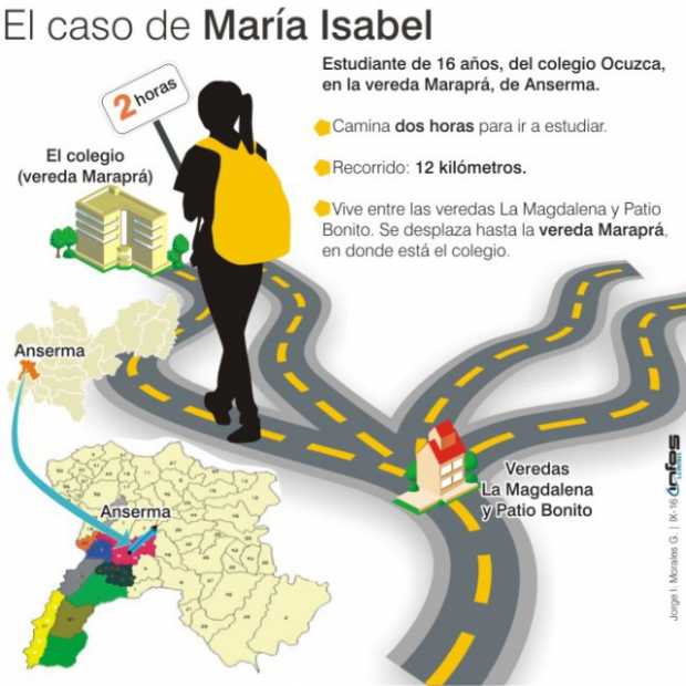 María Isabel Gómez camina dos horas para llegar al colegio Ocuzca, en la vereda Maraprá, de Anserma (ver infografía). “¿Llegas cansada?”, le preguntan.“Uff, agotada”, responde. La fatiga hace que se sienta desubicada durante la primera hora de clase. “Me cuesta prestar atención. Esto no ocurre cuando hay transporte escolar”, indica.