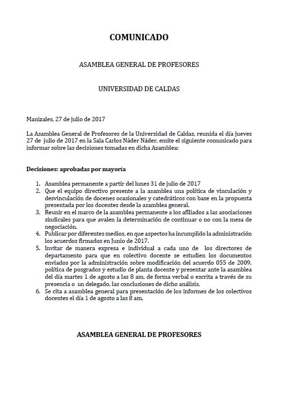 Los profesores de la U. de Caldas decidieron hoy entrar en asamblea permanente a partir del lunes próximo. En un comunicado indican: "Que el equipo directivo presente a la asamblea una política de vinculación y desvinculación de docentes ocasionales y catedráticos con base en la propuesta presentada por los docentes en la asamblea general".