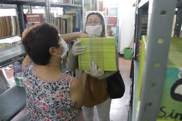 La coordinadora de primaria, María Zoé Puerta, bajó los libros empolvados de los anaqueles de la biblioteca. Los entregará a cada niño, hay suficiente para uno por estudiante y así cumplir con los Derechos Básicos del Aprendizaje.
