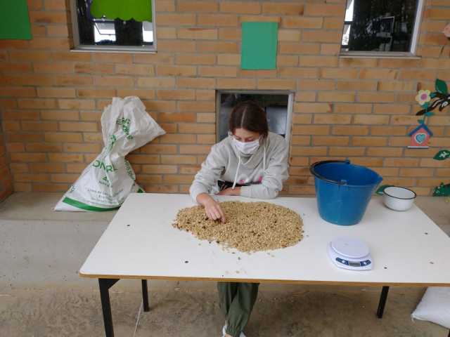 El café pergamino seco es clasificado de forma manual por estudiantes.