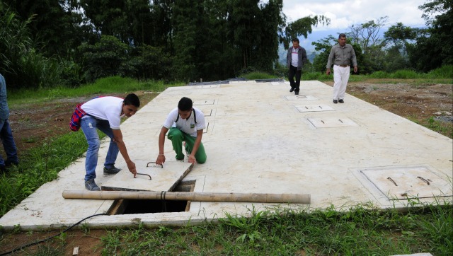 En el colegio se construyó un sistema de alcantarillado para dirigir las aguas a la planta. "Hay dos sistemas sépticos. Si uno deja de funcionar, usamos el otro", explicó Carlos Alberto Salazar, profesional en desarrollo del Comité de Cafeteros de Caldas.