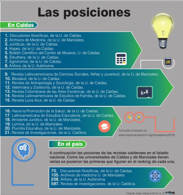 La U. Nacional sede Manizales y la Fundación Universitaria Luis Amigo no tienen revistas indexadas, es decir, publicaciones reconocidas por Colciencias que se incluyen al Sistema Nacional de Indexación de Publicaciones Científicas y Tecnológicas Colombianas por su calidad. Desde la Nacional hay reparos a este criterio. Germán Albeiro Castaño, vicerrector de la U. Nacional sede Manizales, dijo: “El trabajo de nuestros investigadores está calificado con los mejores puntajes en mediciones internacionales, en las que confío más. No puede ser que se establezca que no investigamos simplemente porque tenemos o no una revista”. Mónica Aristizábal, editora de la revista Summa y Iuris de la Luis Amigó, la única publicación de la sede Manizales, señaló que están realizando el proceso de indexación.