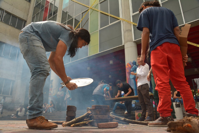 Mientras se realizaba el evento, alumnos de la U. de Caldas continuaban con el paro que cumple hoy 16 días hábiles. Disponían al lado del hall central de la institución los elementos para preparar el almuerzo de quienes protestaban. Entre sus reivindicaciones está más recursos para las universidades públicas.