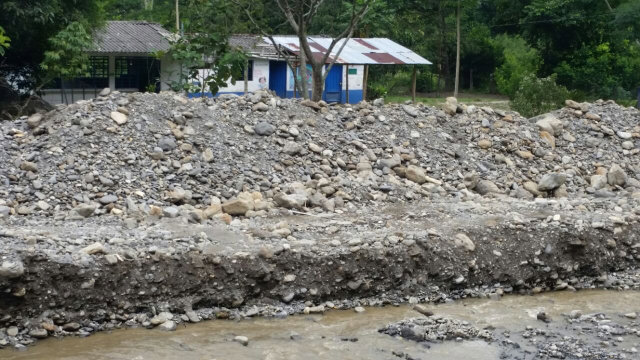 Por eso, la Secretaría de Infraestructura de Caldas, con maquinaria y personal de Invías, realizan la canalización y jarillones en la quebrada. La misión: proteger la escuela amenazada sobre todo en temporada de lluvias como la actual.