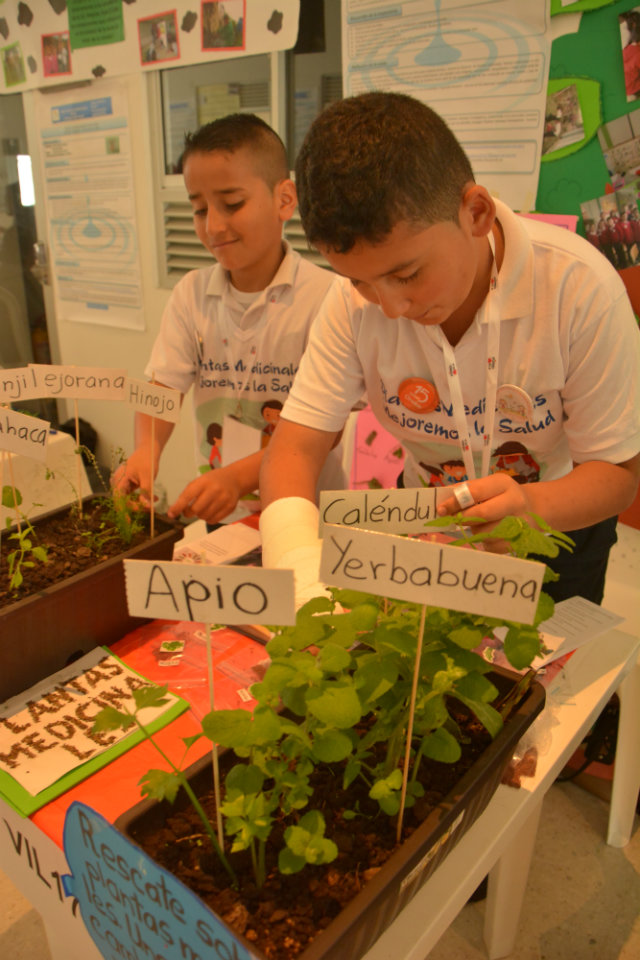 José Manuel Osorio y Miguel Ángel Barco, del colegio Nuestra Señora del Rosario, de Villamaría. “Sembramos plantas medicinales. Queremos mejorar la salud de nuestra comunidad”, contó Miguel.