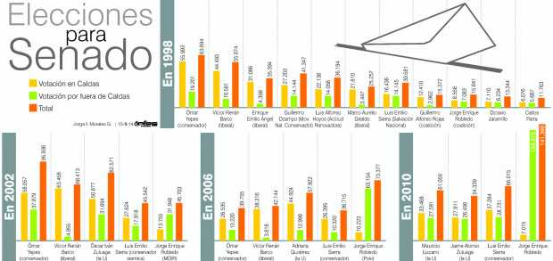 En el 2010, en la más reciente elección para Senado, las mayores votaciones para caldenses fueron las de Mauricio Lizcano y Jaime Alonso Zuluaga, de la U, y Luis Emilio Sierra, conservador. Los tres mostraron cierto equilibrio en las votaciones que lograron en y por fuera del departamento. En cambio, Arturo Yepes, quien al final quedó por fuera, obtuvo 28 mil votos en Caldas, 11 mil votos menos que por fuera de Caldas.