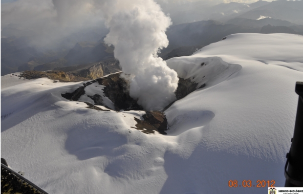 Las alarmas se prendieron desde la semana pasada, cuando profesionales de Ingeominas sobrevolaron el volcán en un helicóptero de la Fuerza Aérea Colombiana. Verificaron que había una columna de gases con una altura aproximada de mil 400 metros sobre la cima del cráter Arenas, además que se había dado una emisión de ceniza en cercanías al borde del cráter.
