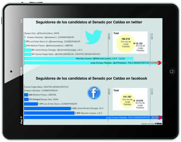 Si se suma el total de seguidores se observa que los ocho aspirantes al Senado agrupaban 180.218 seguidores y sin Jorge Enrique Robledo -nació en Ibagué, pero es de trayectoria caldense-, los siete restantes apenas llegan a 15.132 seguidores.