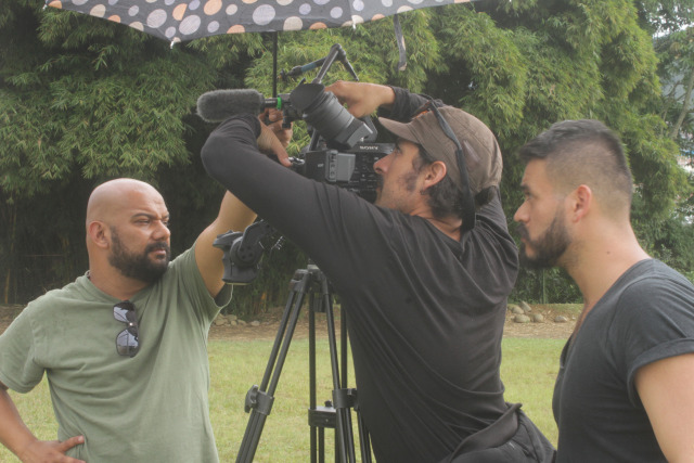 Durante el rodaje de La última dinastía. En la foto Carlos Cruz, productor ejecutivo; Daniel Ocampo, director de sonido, y Leonardo Cárdenas, director. Los tres son egresados de la Escuela de Comunicaciòn Social y Periodismo de la Universidad de Manizales.