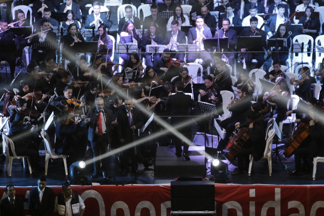 El sonido de la Orquesta rompió el silencio: violines, violas, trompetas, tambores, platillos, oboes y algunos otros más colonizaron el lugar. Los ojos seguían clavados en los 500 músicos que, por primera vez, se daban cita para hacer un concierto en un espacio como este.