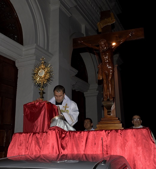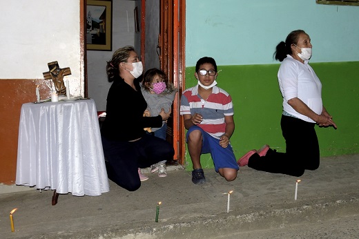 El recorrido comenzó a las 7:00 de la noche del domingo. La pequeña caravana transitó por las principales calles del municipio y estuvo acompañada de rezos y suplicas de los fieles, que se arrodillaron al paso del Señor, clamando protección.