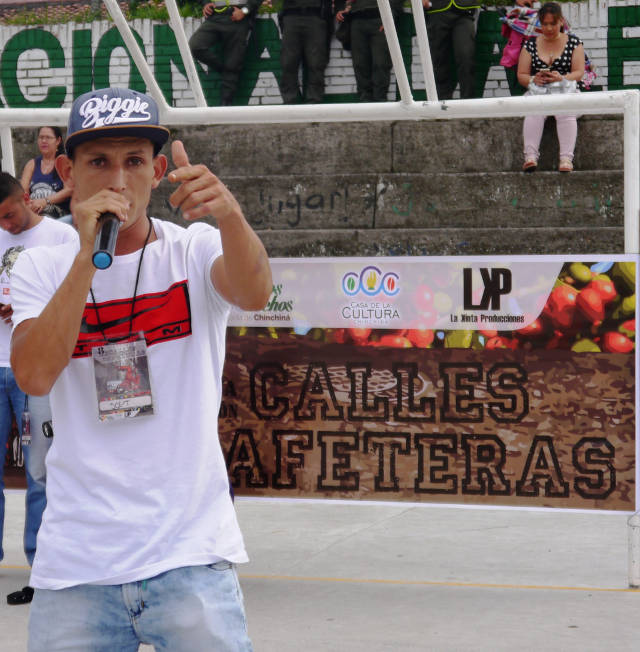 Edier Mesa, conocido como Solt, de Chinchiná, saltó el pasado domingo al escenario que se ubicó en el polideportivo del barrio Rincón Campestre de Chinchiná para celebrar el octavo aniversario del Festival hip-hop Calles Cafeteras, que incentiva a los intérpretes de este género urbano.