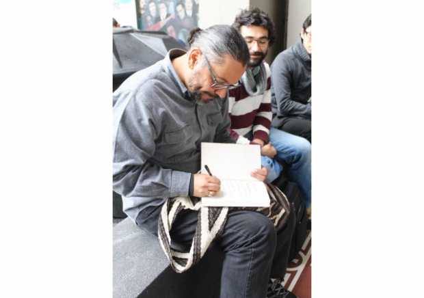 La calidez de este hombre alto, de barba, de amplia familia y camisa afuera habló en un muro de la Universidad de Caldas, sede Palogrande, sobre la creatividad literaria.