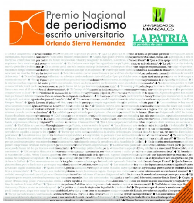 Hoy se entregarán los premios a los ganadores en las tres categorías del IV Premio Nacional de Periodismo Escrito Universitario Orlando Sierra Hernández, que organizan la Universidad de Manizales y LA PATRIA.