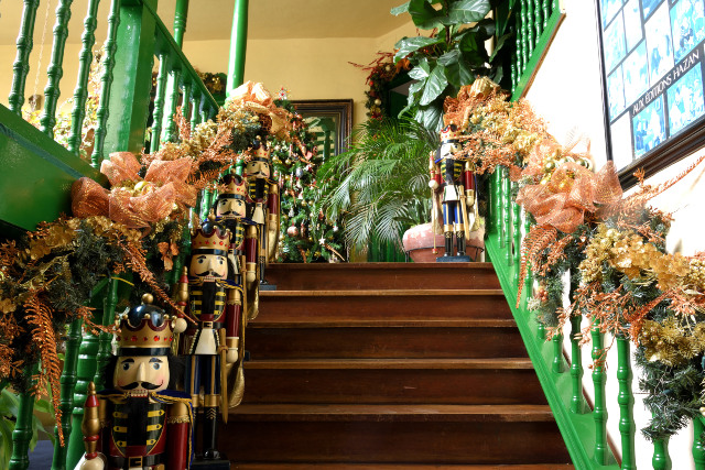 En la planta baja de la vivienda, a los lados del patio central, están el pesebre, el árbol, medias navideñas y un pequeño carrusel, entre otros adornos, mientras que en la escalera, para subir al segundo piso, ubicó cascanueces y en el corredor, otro árbol.