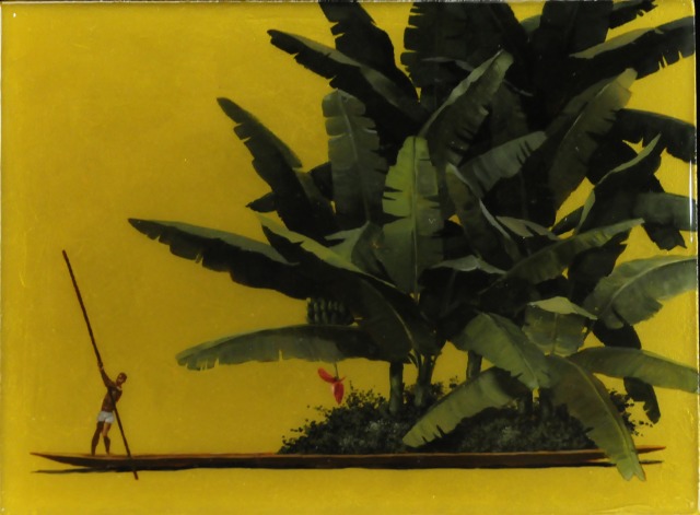 "Este trabajo es una mirada diferente sobre nuestra realidad. Una mirada que pueda hacer parte de la solución y no del conflicto", afirma Ruiz, quien explicó que el génesis de Oro está en una serie llamada Desplazamientos. "Fue la manera que encontré para compartir lo que puede sentir un desplazado. Cuando los pintaba había un barquero y un paisaje como referencia al desplazamiento forzado por la violencia, la exposición se abría con una canoa que llevaba bananeras rojas y de eso hacia siempre un mural", precisó.