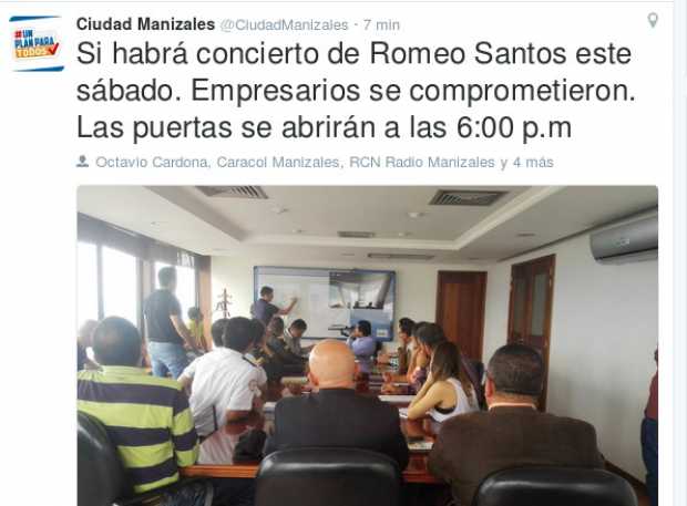 "Si habrá concierto de Romeo Santos este sábado. Empresarios se comprometieron. Las puertas se abrirán a las 6:00 p. m.", se publicó en la cuenta de Twitter de la Alcaldía de Manizales (Ciudad Manizales).
