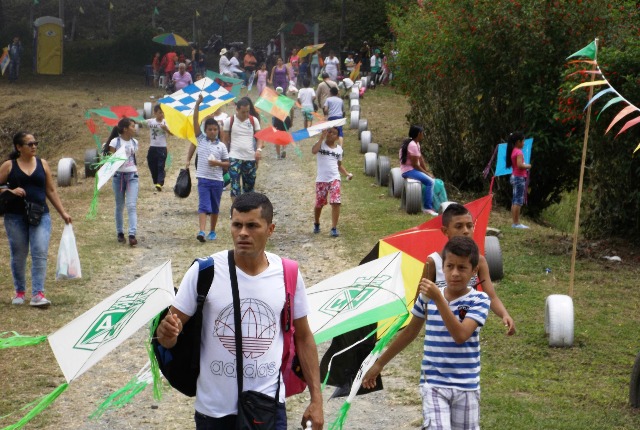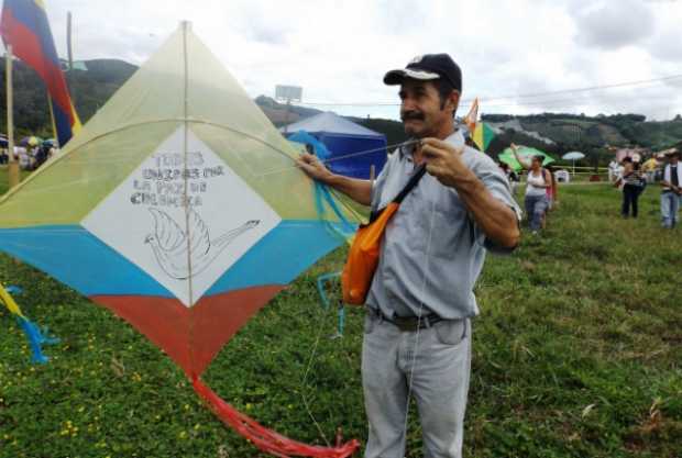 Luis Evelio Velásquez, de 54 años, participó en el concurso de cometas realizado en el lote de La Policía, ubicado en la salida a Palestina. Llevó una alusiva a la paz. “No me da pena venir a jugar con los demás, llevo 15 años asistiendo a la fiesta”, expresó.