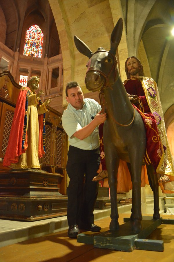 Hace nueve años Gilberto Maya trabaja en la Catedral y es el encargado de la vigilancia y los servicios generales. Antes de la Semana Mayor abre la bodega para sacar uno a uno cada santo y vestirlo.