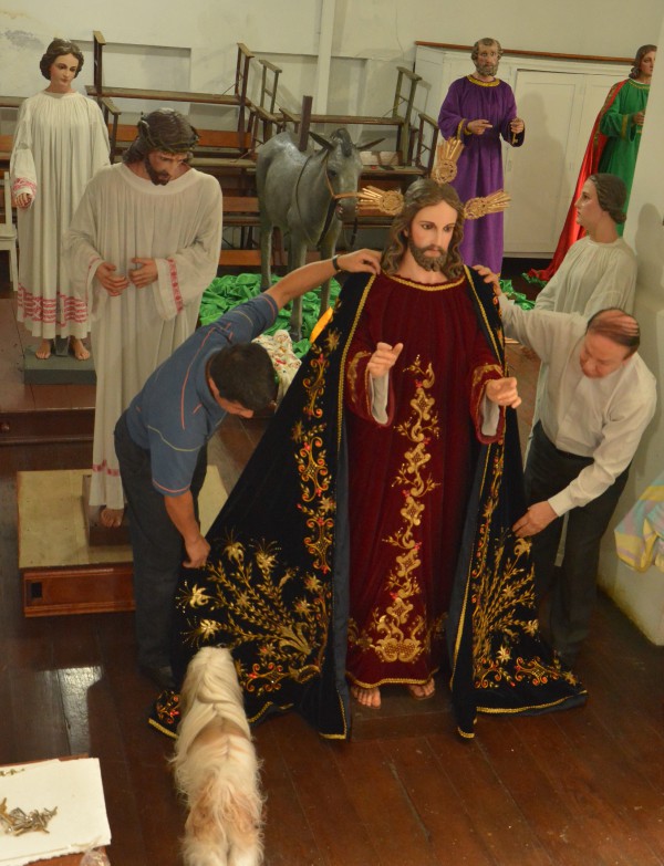 “Cada año se guardan las imágenes bien tapadas. No tienen precio, son de un valor incalculable tanto religioso como económico. El padre Sigrifredo años atrás las hizo retocar y las mantiene conservadas”, dice Diego León, mientras elige los vestidos que lucirán San José, la Virgen María, Jesucristo. Los colores litúrgicos se mantienen, la mayoría de prendas son moradas, rojas y blancas, porque marcan la semana de reflexión que comienza hoy.