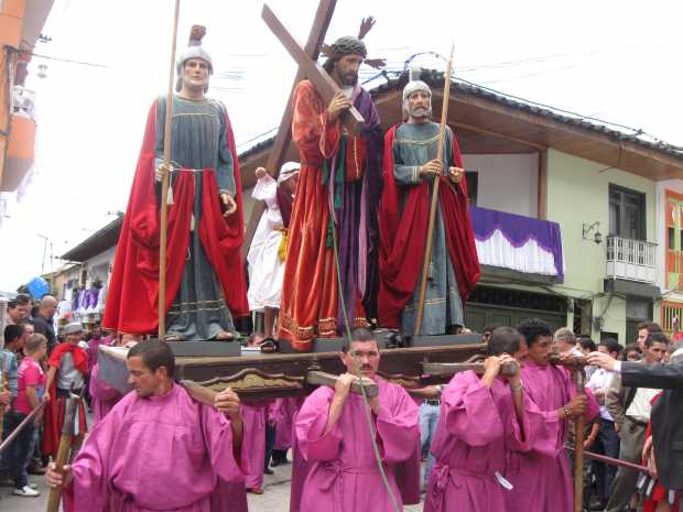 Los ocho vestidos púrpura estuvieron guardados un año. Ahora son doblados cuidadosamente por las manos fuertes de Hernando Botero, Pelos, quien los empaca en una bolsa. El vestuario está listo de nuevo para que lo utilicen él y quienes en el viacrucis de Semana Santa unen fuerzas cargando, por las calles de Aranzazu, a Jesús, el Cirineo y dos soldados romanos.En el pueblo, ubicado en el norte de Caldas, los conocen por su actividad como coteros. Son quienes cada día ponen los hombros para cargar y descargar los camiones que salen y llegan con mercancía al municipio.
