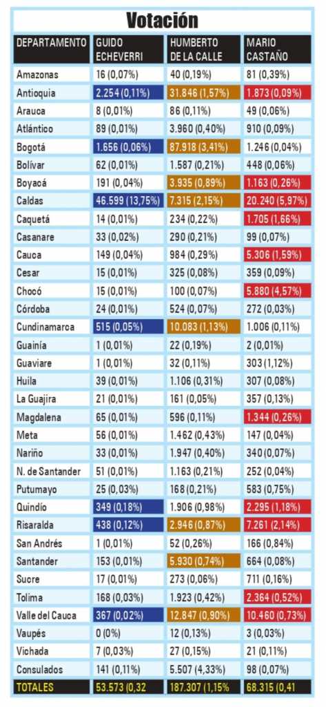 Su ranking, por obvias razones, comienza con Caldas; continúa en el Valle del Cauca, donde sacó un poco más de la mitad de los votos que logró entre los caldenses; sigue Risaralda, donde se le conocieron alianzas que buscaban fortalecer sus aspiraciones; Chocó y Cauca, donde también marcó votaciones altas, igual que en Tolima, Quindío, Antioquia, Caquetá, Magdalena y Boyacá.